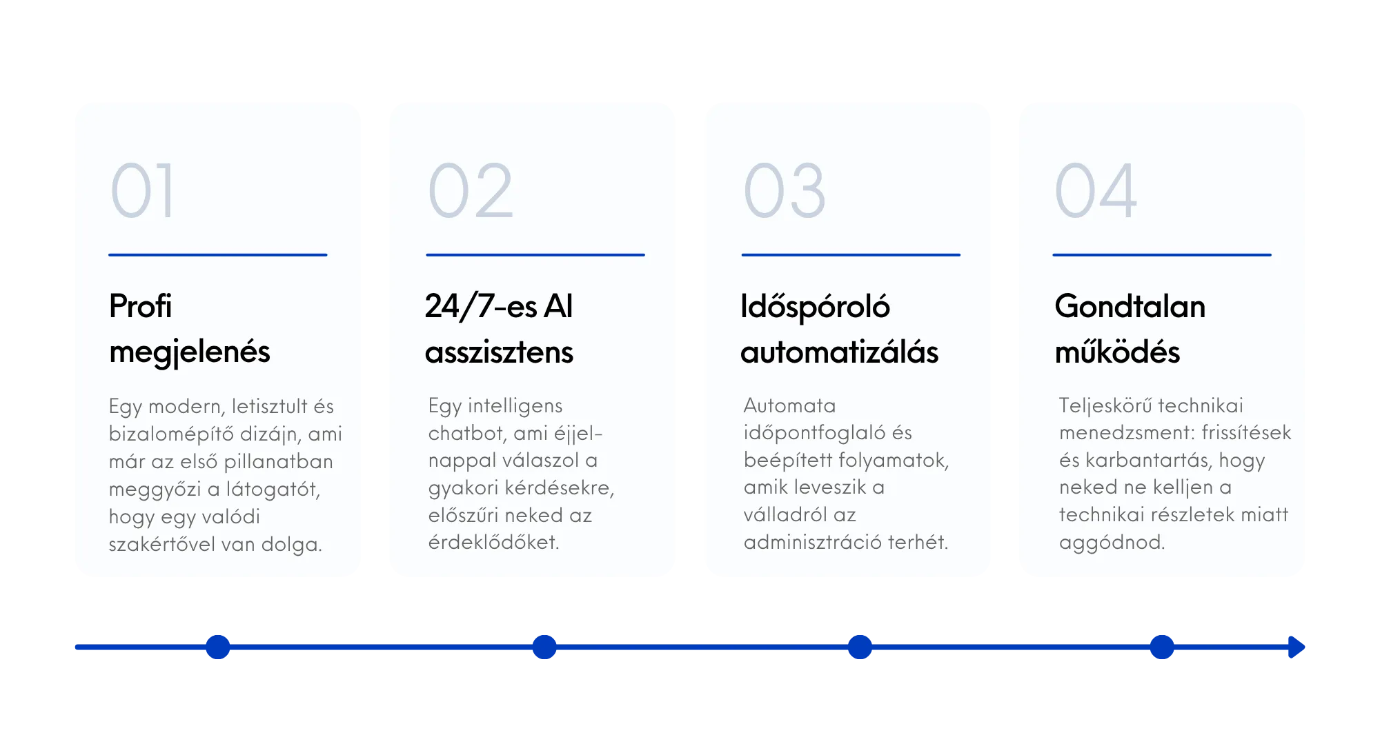A 30 nap letelte után pedig, ha szeretnéd, hogy a szolgáltatói weboldalad hosszú távon is biztonságos, naprakész és hatékony maradjon, választhatod a havi díjas szolgáltatást. Ez a csomag tartalmazza a rendszeres biztonsági frissítéseket, a mentéseket és a folyamatos technikai felügyeletet.