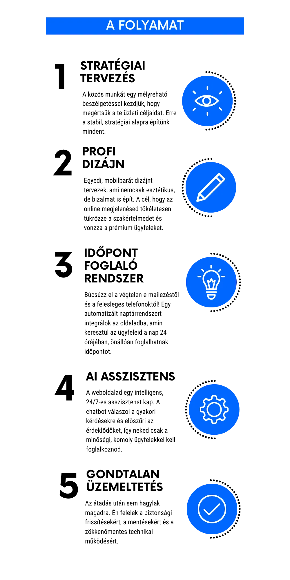 A sikeres online jelenléted 5 kulcsfontosságú, egymásra épülő elemből áll. Ez a rendszer biztosítja, hogy a weboldalad ne csak egy passzív arculati felület, hanem a leghatékonyabb rendszer legyen.
